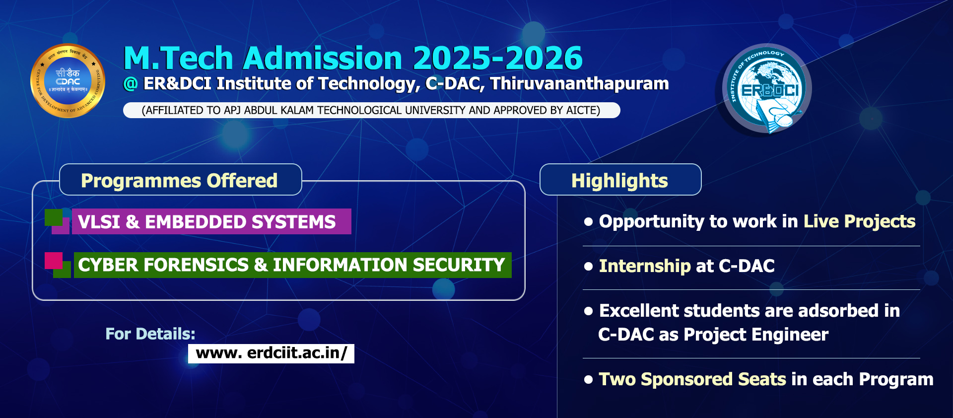 ER&DCI Institute of Technology is the academic wing of Centre for Development of Advanced Computing (CDAC) Thiruvananthapuram. ER&DCI Institute of Technology was started in 2001 with a mission to groom and nurture competitive professionals, empowering them with state-of-the-art skill sets in Electronics and Information Technology. The campus is situated in the heart of Thiruvananthapuram city. The College is affiliated to A P J Abdul Kalam Technological Univeristy(KTU) and approved by All India Council for Technical Education (AICTE). Read more